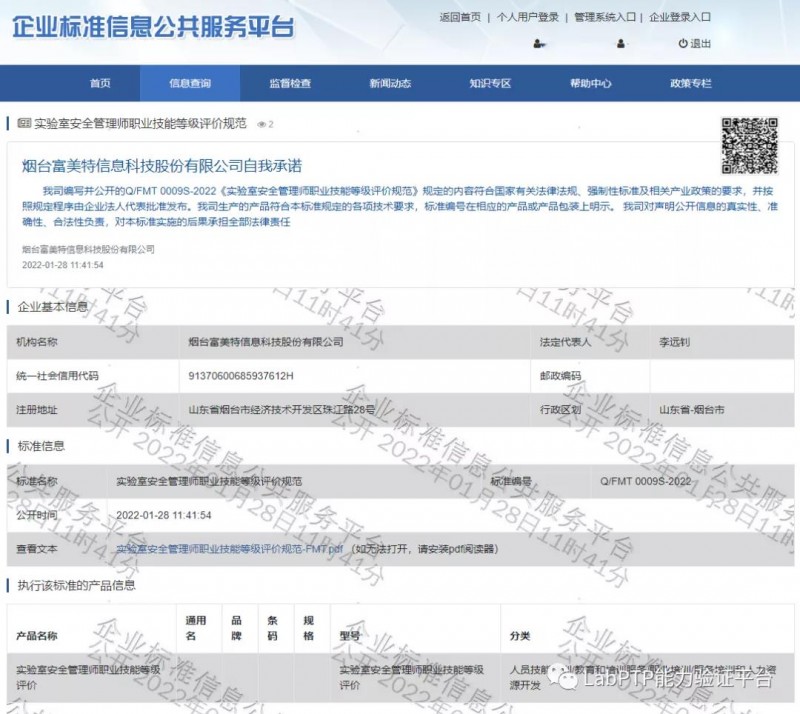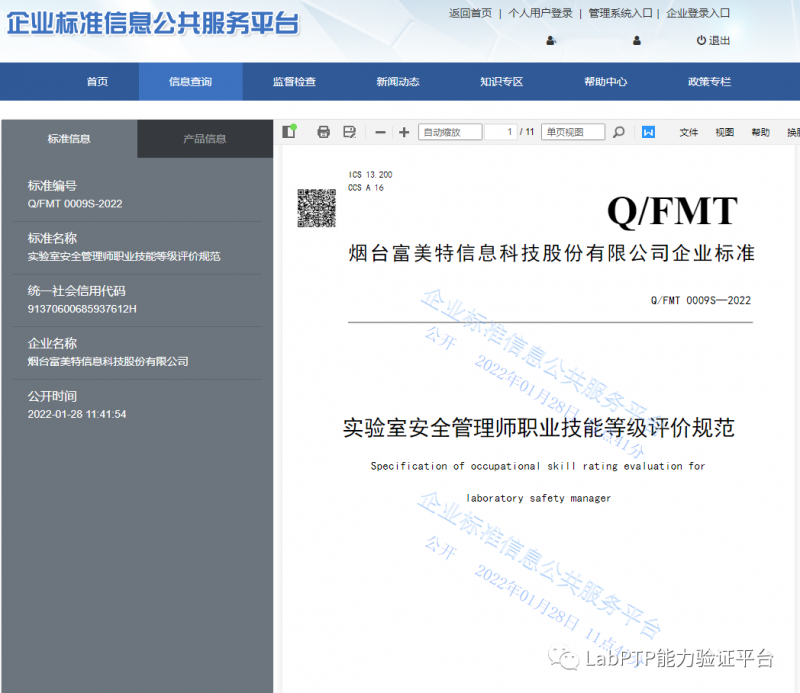 2022年01月28日,由煙臺富美特信息科技股份有限公司(以下稱“食品伙伴網(wǎng)”)和煙臺聯(lián)食檢測科技有限公司(以下稱“能力驗(yàn)證網(wǎng)”)起草的《實(shí)驗(yàn)室安全管理師職業(yè)技能等級評價規(guī)范》(Q/FMT 0009S—2022)企業(yè)標(biāo)準(zhǔn)在國家標(biāo)準(zhǔn)化管理委員會企業(yè)標(biāo)準(zhǔn)信息公共服務(wù)平臺公開發(fā)布,并于2022年02月08日正式實(shí)施。