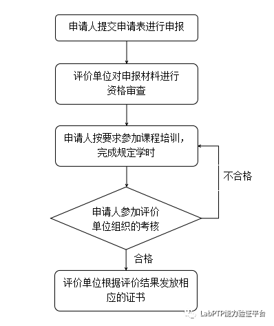 《實(shí)驗(yàn)室安全管理師職業(yè)技能等級評價規(guī)范》立足于實(shí)驗(yàn)室安全管理工作內(nèi)容,將職業(yè)技能等級分為三個級別。符合申報要求,經(jīng)過培訓(xùn)學(xué)習(xí)并考核合格后即可獲得相應(yīng)的等級證書。實(shí)驗(yàn)室安全管理師職業(yè)技能等級評價程序如下圖所示。