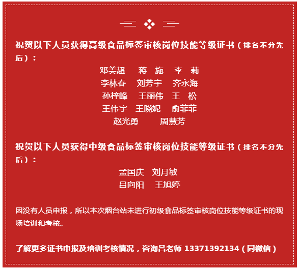經(jīng)過為期三天的系統(tǒng)培訓及現(xiàn)場考核,19名學員全部完成培訓學時并成功獲得“食品標簽審核崗位技能等級證書”,成為全國第二批持“證”上崗的食品標簽審核員!