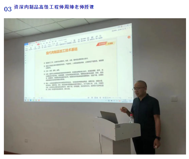 周老師講述了醬鹵肉制品加工基礎(chǔ)知識(shí)、現(xiàn)代肉制品加工技術(shù)基礎(chǔ)、現(xiàn)代加工技術(shù)在醬鹵肉加工中的應(yīng)用、醬鹵肉制品加工技術(shù)創(chuàng)新思路。
