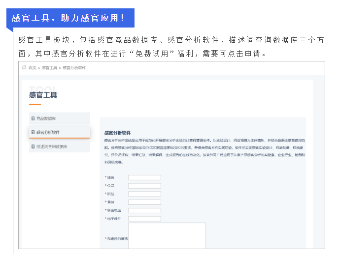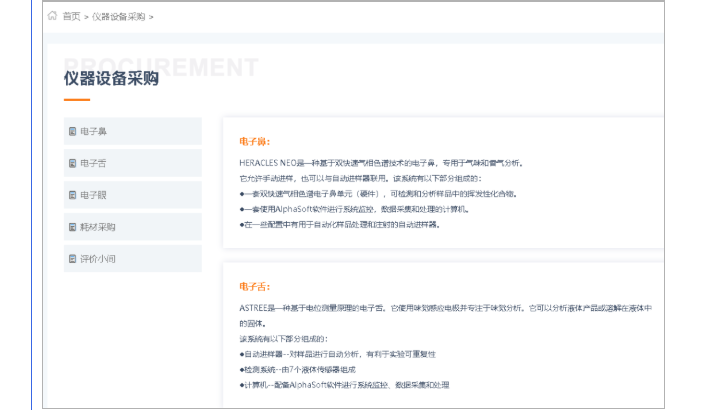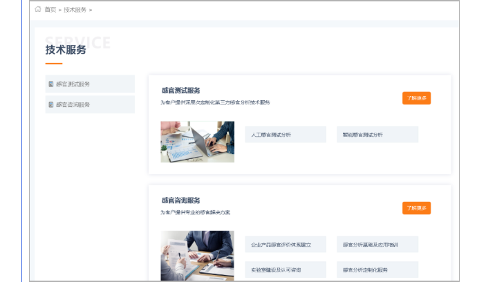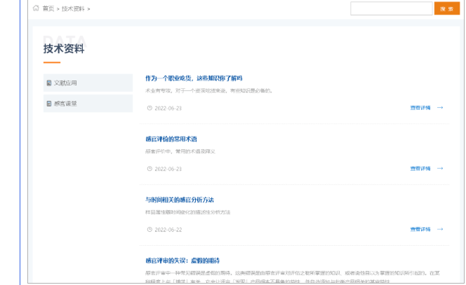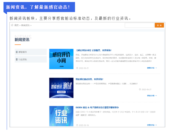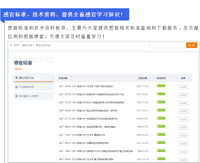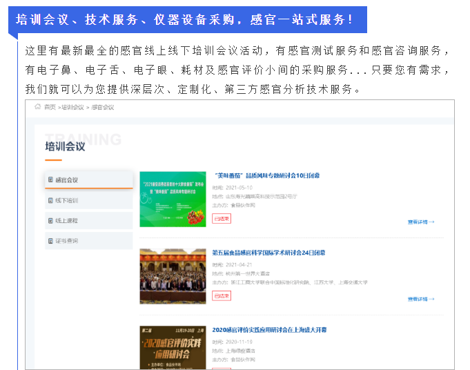 “感知網(wǎng)”官方網(wǎng)站共分為九大板塊,涵蓋新聞資訊、感官標準、技術資料、感官工具、培訓會議、技術服務、儀器設備采購、感官評價員招募等內(nèi)容,界面簡潔有序,重點突出,全方面、多角度展現(xiàn)食品行業(yè)專業(yè)的感官評價應用服務商。