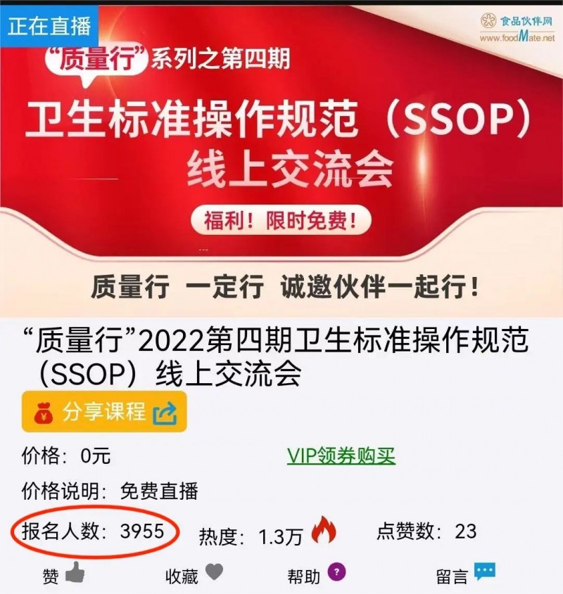 2022年07月08日,“質(zhì)量行”2022第四期 衛(wèi)生標(biāo)準(zhǔn)操作規(guī)范(SSOP)線上交流會在食學(xué)寶線上平臺成功舉辦。