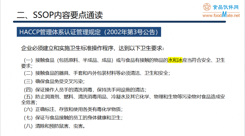 HACCP食品安全管理體系認(rèn)證要求SSOP至少要涉及到GMP規(guī)定的8個(gè)方面主要的衛(wèi)生條件,而SSOP的正確制定和有效執(zhí)行,對控制危害是非常有價(jià)值的。