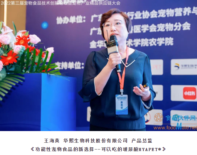 玻尿酸是哺乳動(dòng)物細(xì)胞外基質(zhì)的主要組成成分,具有保水、潤滑、支撐、修復(fù)等重要的生理作用。華熙生物開發(fā)出一款寵物營養(yǎng)專用玻尿酸——HYAPET?透明質(zhì)酸鈉。多項(xiàng)試驗(yàn)研究結(jié)果證明,HYAPET?可被寵物腸胃吸收利用,起到滋養(yǎng)皮膚、順亮毛發(fā)、改善關(guān)節(jié)、調(diào)理腸道等多重作用。此次論壇上,王總監(jiān)介紹了玻尿酸的概況、應(yīng)用歷史以及玻尿酸在寵物食品中的功效作用及使用建議等內(nèi)容,以期為寵物食品企業(yè)在功能性寵物食品的開發(fā)提供新選擇。