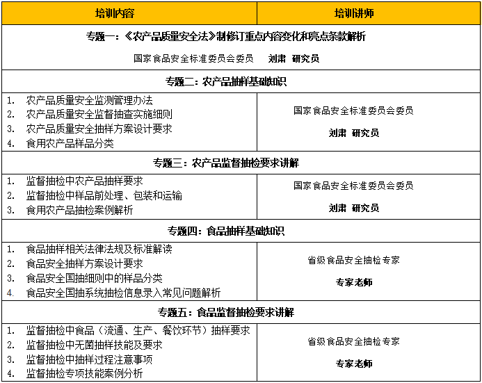 培訓(xùn)期間由國家食品安全標(biāo)準(zhǔn)委員會(huì)委員劉肅老師為大家講解:《農(nóng)產(chǎn)品質(zhì)量安全法》制修訂重點(diǎn)內(nèi)容變化和亮點(diǎn)條款解析、農(nóng)產(chǎn)品抽樣基礎(chǔ)知識(shí)、農(nóng)產(chǎn)品監(jiān)督抽檢要求講解等農(nóng)產(chǎn)品采樣相關(guān)知識(shí)和要求。