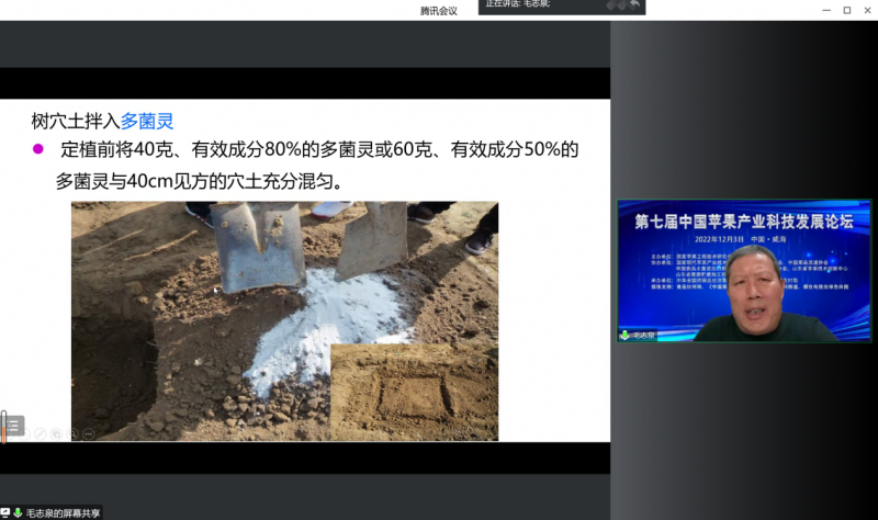 山東農(nóng)業(yè)大學(xué)毛志泉教授做《老齡果園改建蘋(píng)果園栽培障礙防控技術(shù)》報(bào)告,介紹了土壤改良促進(jìn)蘋(píng)果高效栽培的精準(zhǔn)實(shí)用技術(shù)創(chuàng)新研究與應(yīng)用。