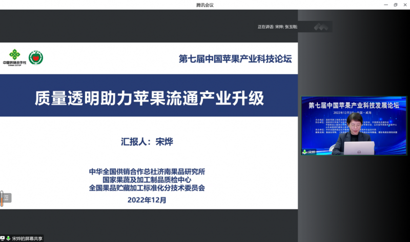 中華全國(guó)供銷(xiāo)合作總社濟(jì)南果品研究所副所長(zhǎng)宋燁研究員做《質(zhì)量透明助力蘋(píng)果流通產(chǎn)業(yè)升級(jí)》報(bào)告,介紹了“蘋(píng)果質(zhì)量透明工程”建設(shè)思路,分享了用數(shù)字化表征優(yōu)勢(shì)區(qū)域蘋(píng)果特色,推動(dòng)“三品一標(biāo)”建設(shè)的研究與實(shí)踐。
