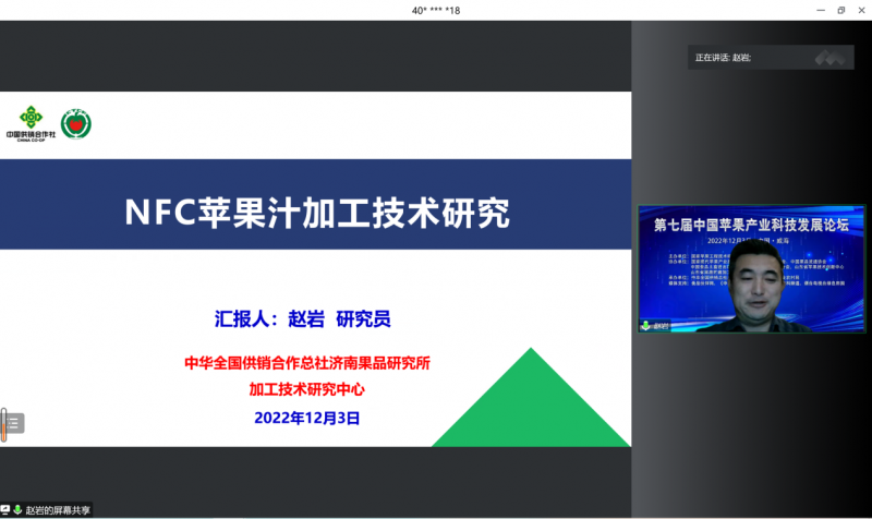 中華全國(guó)供銷(xiāo)合作總社濟(jì)南果品研究所黨委委員、加工技術(shù)中心主任趙巖研究員做《NFC蘋(píng)果汁加工技術(shù)研究》報(bào)告,從原料、技術(shù)、裝備多維度介紹了NFC果汁的研究與實(shí)踐。