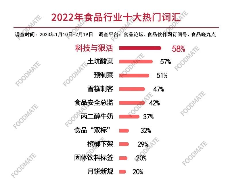 2023年2月19日,由食品伙伴網(wǎng)發(fā)起的“2022年食品行業(yè)十大熱門詞匯”評選活動結(jié)束。按照以往的慣例,本次活動首先由食品論壇的熱心網(wǎng)友針對2022年熱門事件概括成一個關(guān)鍵詞提交,后經(jīng)過整理篩選出17個候選詞匯,并于2023年1月10日-2月19日在食品論壇投票。今年的投票,我們增加了“食品論壇”“食品伙伴網(wǎng)訂閱號”“食品晚九點”三個微信渠道,期間共有1381 位經(jīng)過審核認證的注冊網(wǎng)友參與投票,最終選出“科技與狠活”、“土坑酸菜”、“預(yù)制菜”等十大熱門詞匯。