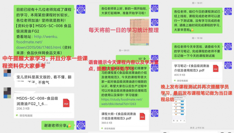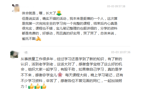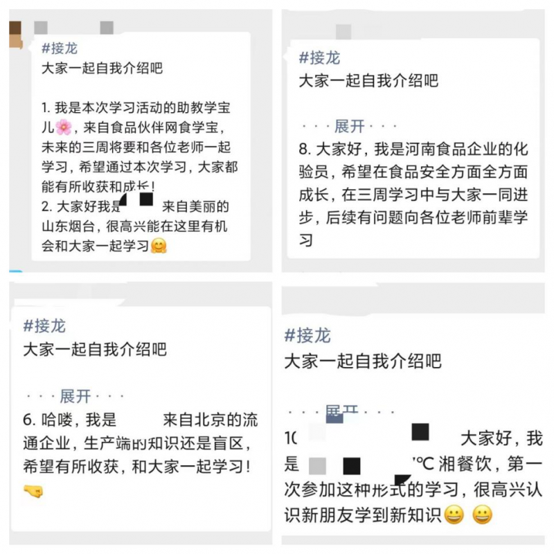 “一起學(xué)·食品生產(chǎn)現(xiàn)場(chǎng)質(zhì)量控制”活動(dòng)開(kāi)始第一天,為了使學(xué)友之間更加熟絡(luò),為接下來(lái)的學(xué)習(xí)做好準(zhǔn)備,特地安排出一天進(jìn)行了班會(huì)。班會(huì)期間,在助教老師的帶領(lǐng)下,來(lái)自全國(guó)各地的學(xué)員,在同一個(gè)學(xué)習(xí)群中自我介紹,表達(dá)自己參加活動(dòng)的初衷,以及希望獲得的收獲,互相認(rèn)識(shí),互相鼓勵(lì),氣氛活躍,對(duì)接下來(lái)三周的學(xué)習(xí)充滿了期待。