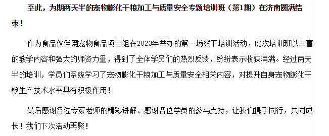 2023年4月1-3日,由食品伙伴網(wǎng)主辦的寵物膨化干糧加工與質(zhì)量安全專題培訓(xùn)班(第1期)在濟(jì)南(食品伙伴網(wǎng) 感官分析研究中心)如期開班!來自乖寶、路斯、安寵、藍(lán)氏、帕特、森森、寵之優(yōu)品、寵愛生活、健合、豆柴、高爺家、青島喜躍生命健康、山東宜生生物、山東畜牧獸醫(yī)職業(yè)學(xué)院等20多家企事業(yè)單位,40余名寵物食品企業(yè)的高層管理、研發(fā)、品控、生產(chǎn)等人員齊聚一堂,共同交流學(xué)習(xí)。