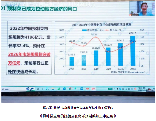 解萬翠教授,青島科技大學(xué)海洋科學(xué)與生物工程學(xué)院“海洋生物與健康食品”創(chuàng)新團(tuán)隊帶頭人。線上為大家介紹了傳統(tǒng)發(fā)酵食品中優(yōu)勢嗜鹽菌和關(guān)鍵酶的挖掘,風(fēng)味微生物的多組學(xué)代謝途徑解析,最終分享了海洋預(yù)制菜肴的專用風(fēng)味料開發(fā)策略,基于同源微生物和酶的增效進(jìn)一步提升風(fēng)味品質(zhì),增加預(yù)制菜鮮美味感,成為預(yù)制菜吸引消費(fèi)者的關(guān)鍵。此途徑可用于預(yù)制菜新品開發(fā)和風(fēng)味提升的需求,推動預(yù)制菜產(chǎn)業(yè)的發(fā)展戰(zhàn)略。