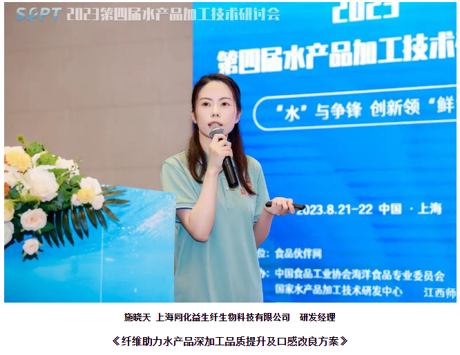 施曉天,上海同化益生纖產(chǎn)品研發(fā)經(jīng)理,長期從事食品原輔料配料開發(fā)及產(chǎn)品工藝研發(fā)工作。目前消費(fèi)者對食品需求已從填飽肚子,轉(zhuǎn)化為追求品質(zhì)、口感及健康,但現(xiàn)狀是部分產(chǎn)品經(jīng)過深加工,口感下降,品質(zhì)難以保障?;谑袌鲒厔菁跋M(fèi)者對品質(zhì)需求,加工企業(yè)對產(chǎn)品升級及創(chuàng)新需求也在不斷提高。益生纖專注天然植物營養(yǎng)纖維產(chǎn)品研究,施經(jīng)理結(jié)合魚片、魚糜制品、丸腸類等具體產(chǎn)品案例,介紹了通過纖維素解決質(zhì)構(gòu)口感,提升品質(zhì)的標(biāo)準(zhǔn)化產(chǎn)品解決方案,助力水產(chǎn)品加工高品高質(zhì)量發(fā)展。