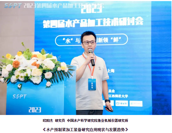 歐陽杰研究員,中國水產(chǎn)科學(xué)研究院漁業(yè)機(jī)械儀器研究所加工裝備研究室副主任。歐陽老師報告結(jié)合魚蝦蟹等加工機(jī)械設(shè)備進(jìn)行了目前水產(chǎn)預(yù)制菜加工裝備研究與應(yīng)用現(xiàn)狀的分享,包括殺魚機(jī)、去鱗去臟、切割分割、對蝦機(jī)械化脫殼、清洗開背、蟹殼肉分離等預(yù)處理設(shè)備以及魚糜制品、水產(chǎn)預(yù)制菜常見案例、水產(chǎn)罐頭等加工、熟制、殺菌設(shè)備產(chǎn)線等。分析了水產(chǎn)預(yù)制菜產(chǎn)業(yè)現(xiàn)狀及存在的問題,水產(chǎn)預(yù)制菜加工裝備發(fā)展趨勢等內(nèi)容,為水產(chǎn)加工設(shè)備產(chǎn)線的研究開發(fā)及企業(yè)應(yīng)用做了參考和引領(lǐng)。