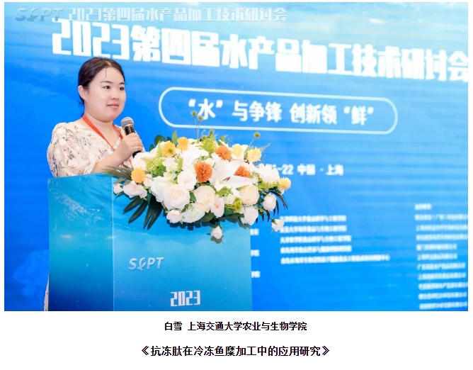 上海交通大學(xué)農(nóng)業(yè)與生物學(xué)院,白雪老師,主要圍繞抗凍肽具有調(diào)控冷凍食品中冰晶結(jié)構(gòu)作用特性,介紹了抗凍肽挖掘、制備、活性評價、冷凍食品加工應(yīng)用等方面研究進(jìn)展,并進(jìn)一步分析了抗凍肽調(diào)控冷凍魚糜加工品質(zhì)的作用機(jī)制,同時闡述了基于實驗設(shè)計、數(shù)據(jù)分析及統(tǒng)計模型建立等方法應(yīng)用構(gòu)建抗凍肽調(diào)控冷凍魚糜加工品質(zhì)的理論模型。