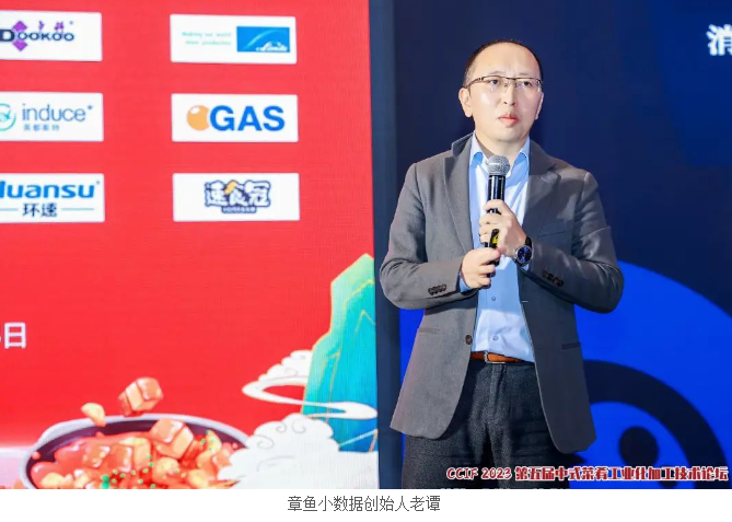 在CCIF2023現(xiàn)場(chǎng)章魚(yú)小數(shù)據(jù)創(chuàng)始人老譚發(fā)表了題目為《餐飲零售化趨勢(shì)下的預(yù)制菜發(fā)展》的演講。
