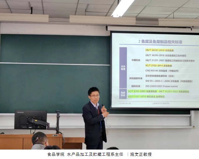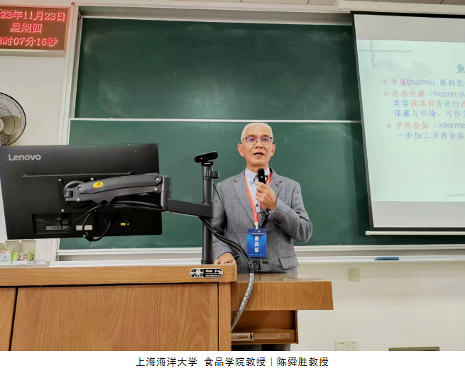 11月25日上午,上海海洋大學食品學院水產(chǎn)品加工及貯藏工程系主任 施文正老師首先為大家做“魚糜及其魚糜制品品質評價介紹”的理論知識分享。
