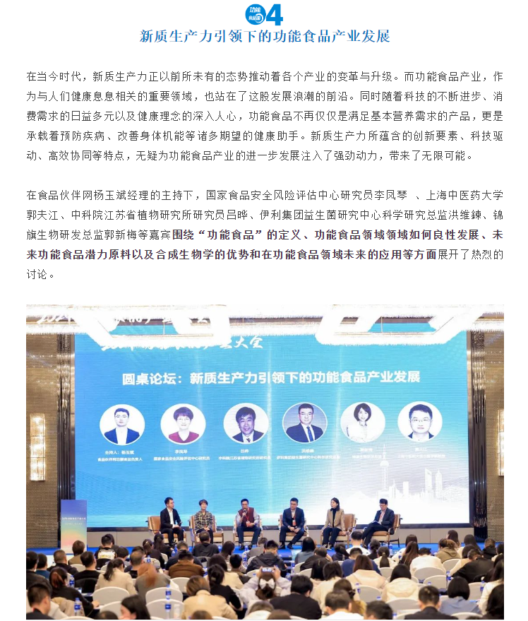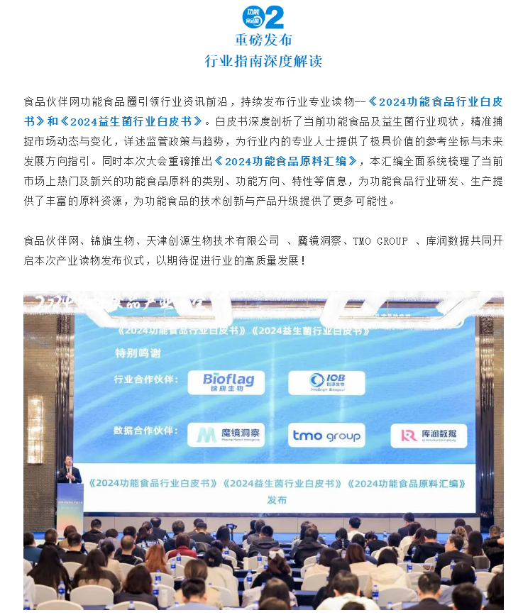 2024年11月13日由食品伙伴網(wǎng)主辦的“2024功能食品產(chǎn)業(yè)大會(huì)”在上海卓越鉑爾曼大酒店盛大開(kāi)幕。大會(huì)以“科學(xué)循證 技術(shù)創(chuàng)新”為主題,共設(shè)置35場(chǎng)精彩報(bào)告,3家企業(yè)參觀游學(xué)、3本高質(zhì)量刊物發(fā)布、1場(chǎng)圓桌論壇以及專(zhuān)業(yè)展位展示創(chuàng)新,400名與會(huì)人員參與交流,并有來(lái)自行業(yè)權(quán)威專(zhuān)家、高校、領(lǐng)航企業(yè)代表、一線生產(chǎn)企業(yè)研發(fā)人員等,共同探討功能食品行業(yè)前沿研究,行業(yè)法規(guī),創(chuàng)新技術(shù),共同促進(jìn)功能食品行業(yè)的健康快速發(fā)展!