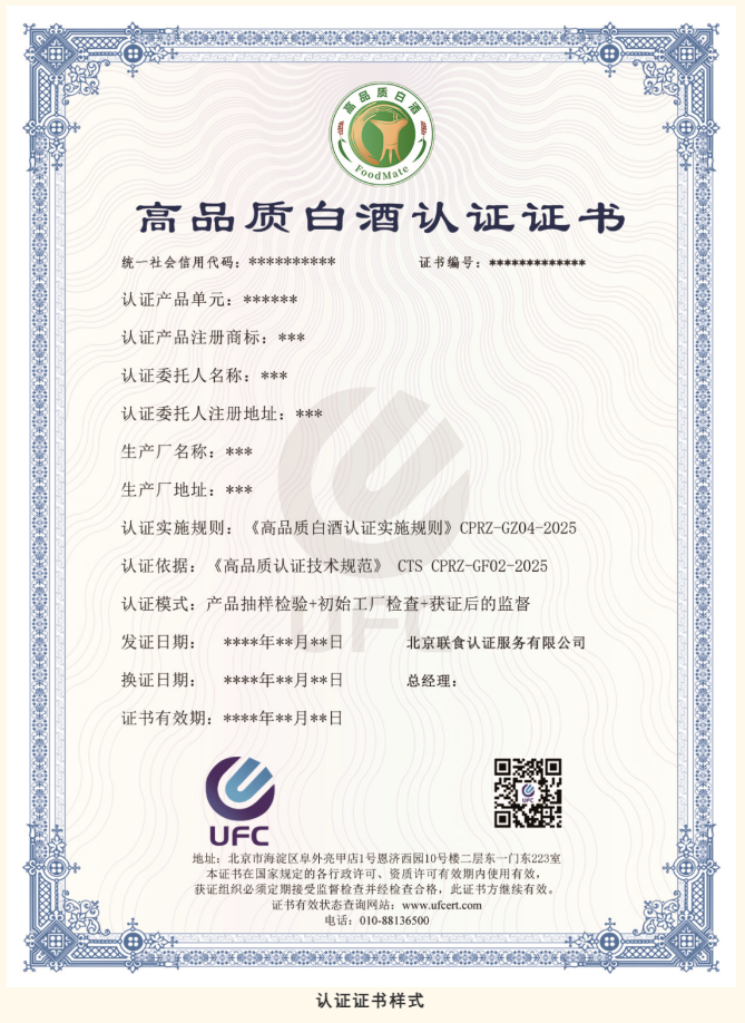高品質(zhì)白酒認(rèn)證是依據(jù)北京聯(lián)食認(rèn)證服務(wù)有限公司經(jīng)國(guó)家認(rèn)監(jiān)委備案的《高品質(zhì)白酒認(rèn)證實(shí)施規(guī)則》及認(rèn)證技術(shù)規(guī)范,對(duì)白酒生產(chǎn)企業(yè)的原輔料采購(gòu)驗(yàn)收管理、釀酒生產(chǎn)管理、勾調(diào)與包裝生產(chǎn)管理、檢驗(yàn)管理、食品安全追溯管理、生產(chǎn)衛(wèi)生規(guī)范管理等方面進(jìn)行現(xiàn)場(chǎng)檢查;對(duì)酒類產(chǎn)品的食品安全指標(biāo)、理化指標(biāo)、感官指標(biāo)等進(jìn)行抽樣檢驗(yàn)和品評(píng)的認(rèn)證活動(dòng)。通過(guò)一次認(rèn)證活動(dòng)對(duì)高品質(zhì)白酒生產(chǎn)保證能力及產(chǎn)品安全、質(zhì)量安全等做出全面評(píng)價(jià),以評(píng)定企業(yè)產(chǎn)品是否符合《高品質(zhì)白酒認(rèn)證實(shí)施規(guī)則》及認(rèn)證技術(shù)規(guī)范的要求。