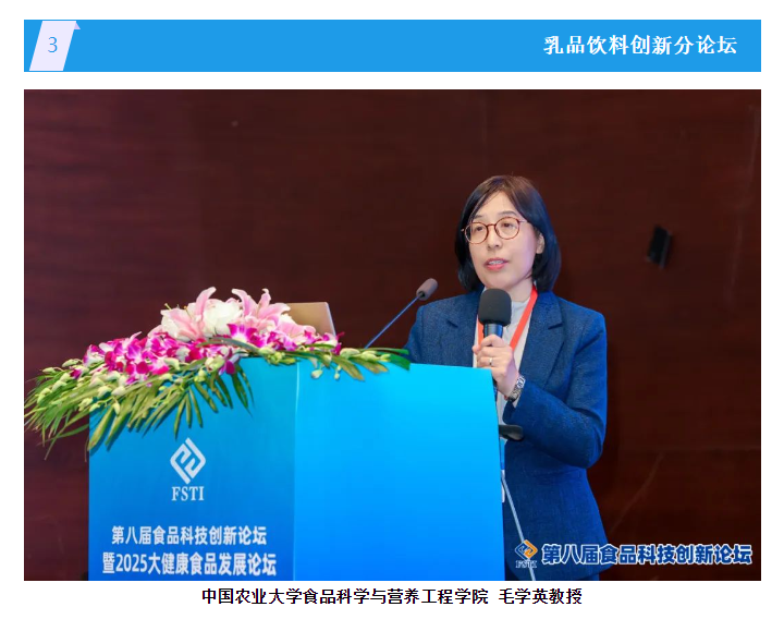 中國(guó)農(nóng)業(yè)大學(xué)食品科學(xué)與營(yíng)養(yǎng)工程學(xué)院毛學(xué)英教授在《乳源活性成分的營(yíng)養(yǎng)健康作用及加工穩(wěn)定性》的報(bào)告中介紹了乳蛋白、乳脂肪球膜等乳源活性成分的營(yíng)養(yǎng)健康作用、加工環(huán)節(jié)對(duì)乳源活性成分穩(wěn)定性的影響以及乳源活性成分的加工穩(wěn)定性。愛(ài)爾蘭食品局駐華代表處高級(jí)專(zhuān)員吳靜女士進(jìn)行了《愛(ài)爾蘭-功能性乳品的可持續(xù)營(yíng)養(yǎng)之道》的報(bào)告介紹,闡述了愛(ài)爾蘭乳業(yè)的概況、愛(ài)爾蘭乳業(yè)的可持續(xù)發(fā)展路徑、功能性乳蛋白市場(chǎng)及發(fā)展前景以及愛(ài)爾蘭可持續(xù)乳品原料的市場(chǎng)應(yīng)用。天津科技大學(xué)食品科學(xué)與工程學(xué)院王浩教授在《果蔬汁飲料加工技術(shù)革新:品質(zhì)提升與功能化開(kāi)發(fā)趨勢(shì)》的報(bào)告中,闡述了果蔬汁飲料的市場(chǎng)現(xiàn)狀與消費(fèi)趨勢(shì)的變化,剖析了當(dāng)前消費(fèi)者個(gè)性化的健康需求,還介紹了冷壓榨、超高壓殺菌等新加工技術(shù)的優(yōu)勢(shì),最后介紹了針對(duì)特定人群的功能化產(chǎn)品開(kāi)發(fā)。維利奧(上海)食品貿(mào)易有限公司技術(shù)與合規(guī)總監(jiān)李艷紅分享了《高端乳原料的應(yīng)用》,介紹了紹其上市產(chǎn)品無(wú)乳糖濃縮牛奶蛋白MPC65的理化性質(zhì)和營(yíng)養(yǎng)特性,并進(jìn)一步詳述了其在國(guó)外針對(duì)濃縮牛奶蛋白高蛋白飲品應(yīng)用中對(duì)德國(guó)消費(fèi)者的調(diào)研結(jié)果。上海理工大學(xué)董慶利教授分享了《乳品飲料微生物防控及聯(lián)合抑菌開(kāi)發(fā)及機(jī)制研究》的報(bào)告,主要介紹了在模擬食品介質(zhì)中益生元和益生菌聯(lián)合處理對(duì)單增李斯特菌的抑菌作用機(jī)制進(jìn)展,包括低聚果糖聯(lián)合植物乳桿菌對(duì)單增李斯特菌生長(zhǎng)能力、體外粘附和入侵宿主細(xì)胞的能力以及對(duì)毒性因子基因表達(dá)水平的影響,為今后在特殊食品中合理使用抑菌劑和實(shí)現(xiàn)有害菌的生物防控提供了理論基礎(chǔ)。南開(kāi)大學(xué)副研究員王津在《食品營(yíng)養(yǎng)與膳食干預(yù)》的報(bào)告中介紹了食品營(yíng)養(yǎng)與膳食干預(yù)的研究進(jìn)展、基于人群營(yíng)養(yǎng)干預(yù),詳述了人群隊(duì)列分析和精準(zhǔn)健康管理研究以及功能食品如功能微生物、藥食新資源和營(yíng)養(yǎng)素等的功能探究、營(yíng)養(yǎng)與免疫調(diào)節(jié)研究。食品伙伴網(wǎng)創(chuàng)新研究中心高級(jí)分析師王文偉在《創(chuàng)新視角下的乳飲市場(chǎng):熱門(mén)品類(lèi)的策略解析》報(bào)告中,利用食品伙伴網(wǎng)產(chǎn)品數(shù)據(jù)庫(kù),梳理了2024年以來(lái)乳品飲料市場(chǎng)的新動(dòng)向,聚焦果蔬汁、茶飲料、含乳飲料、中式養(yǎng)生水、調(diào)制乳、滅菌乳、發(fā)酵乳等熱門(mén)品類(lèi)新品,通過(guò)具體產(chǎn)品案例,從口味創(chuàng)新、工藝改進(jìn)、營(yíng)養(yǎng)價(jià)值及市場(chǎng)營(yíng)銷(xiāo)策略等多維度,深入探討了品類(lèi)背后的創(chuàng)新動(dòng)力和策略布局。