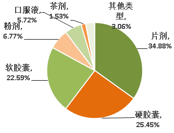 我國保健食品包含18個(gè)二級(jí)類別,通過對(duì)食品伙伴網(wǎng)《食品飲料產(chǎn)品數(shù)據(jù)庫》中數(shù)據(jù)進(jìn)度統(tǒng)計(jì)分析發(fā)現(xiàn):片劑、硬膠囊、軟膠囊是占比最大的3個(gè)類別,共占市場(chǎng)份額的82.92%;其次,粉劑、口服液和茶劑共占14.02%;其他類別占比較少,約占3.06%。