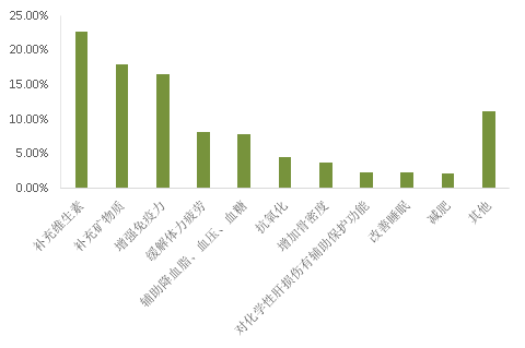通過對(duì)食品伙伴網(wǎng)《食品飲料產(chǎn)品數(shù)據(jù)庫》中保健食品的保健功能數(shù)據(jù)分析發(fā)現(xiàn):補(bǔ)充維生素、補(bǔ)充礦物質(zhì)和增強(qiáng)免疫力是占比較高的功能類型,共占57.5%;其次為緩解體力疲勞、輔助降血脂血壓血糖、抗氧化、增強(qiáng)骨密度、對(duì)化學(xué)性肝損傷有輔助保護(hù)功能、改善睡眠、減肥等幾種功能類型,共占31.3%。