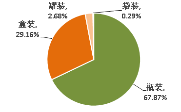 目前市場(chǎng)上產(chǎn)品包裝形式多種多樣,通過對(duì)食品伙伴網(wǎng)《食品飲料產(chǎn)品數(shù)據(jù)庫》中保健食品的包裝形式分析發(fā)現(xiàn):大部分保健食品為瓶裝,約占67.87%;其次為盒裝,約占29.16%;罐裝和袋裝占比較少,共占2.97%左右。